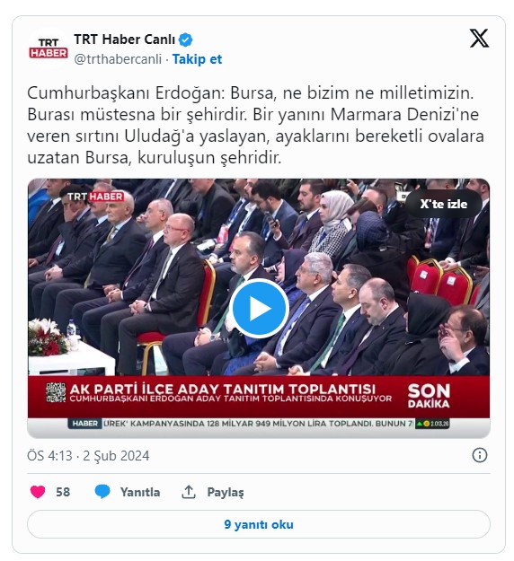Cumhurbaşkanı Recep Tayyip Erdoğan, AK Parti Bursa İlçe Belediye Başkan Adayları Tanıtım Toplantısı’nda konuştu.